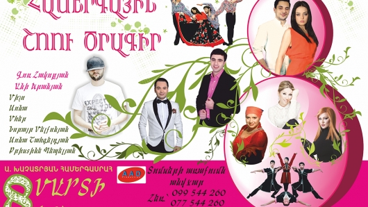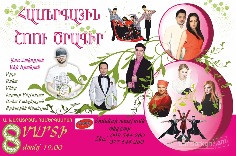 Մեր սիրելի կանանց և աղջիկներին, գեղեցկության, հմայքի ու մեծարմանի տոնի կապակցությամբ, մարտի 8-ին Արամ Խաչատրյան համերգասրահում տեղի կունենա տոնական հրաշալի համերգ՝ հայկական շոու-բիզնեսի ամենագեղեցիկ ու հմայիչ երգչուհիների, ամենասիրված ու սպասված երգիչների մասնակցությամբ: