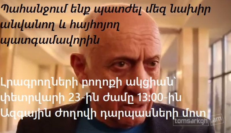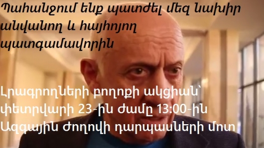 Փետրվարի 23-ին ժամը 13:00-ին Ազգային ժողովի դարպասների մոտ հրավիրում ենք լրագրողների, խմբագիրների, հասարակական կազմակերպությունների, Ազգային ժողովի պատգամավորների, իրավապաշտպանների և բոլոր շահագրգիռ անձանց մասնակցելու լրագրողների բողոքի ակցիային, որը նպատակ ունի դատապարտել Հանրապետական խմբակցության պատգամավոր Մհեր Սեդրակյանի պահվածքը լրագրողների նկատմամբ: Հիշեցնենք, որ փետրվարի 19-ին Ազգային ժողովում Մհեր Սեդրակյանը, տեսնելով լրագողների հոսքը, ասել էր՝ «Էս ի՞նչ նախիր ա»: Լրագրողներից մեկը հորդորել էր չվիրավորել իրենց, նման պիտակներով չխոսել ԶԼՄ ներկայացուցիչների հետ, սակայն պատգամավորը զայրացել էր և անգամ հայհոյել լրագրողներին: