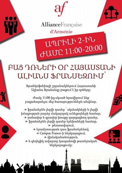 Dans le cadre du mois de la Francophonie, l’Alliance française d’Arménie ouvre ses portes! A partir de 11h, venez découvrir toutes nos activités gratuitement : cours pour débutants et avancés, ateliers de conversation, tests de placement, cours de français pour les enfants, ateliers d’écriture d’un texte, ateliers de musique en français, présentation de Campus France, tombola et, pour finir en beauté, spectacle de théâtre ! Soyez au rendez-vous !