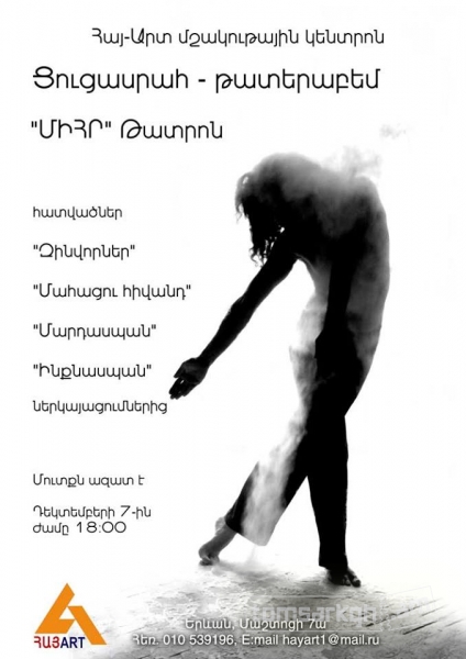 Սիրով հրավիրում ենք Ձեզ «ՄԻՀՐ» թատրոնի «Պիեսներ մահվան մասին» շարքի ներկայացումների ցուցադրմանը (հատվածներ «Զինվորներ», «Մահացու հիվանդ», «Մարդասպան», «Ինքնասպան» ներկայացումներից) , որը կանցկացվի նոր ֆորմատով՝ ցուցասրահը կվերծվի թատերաբեմի:
