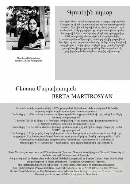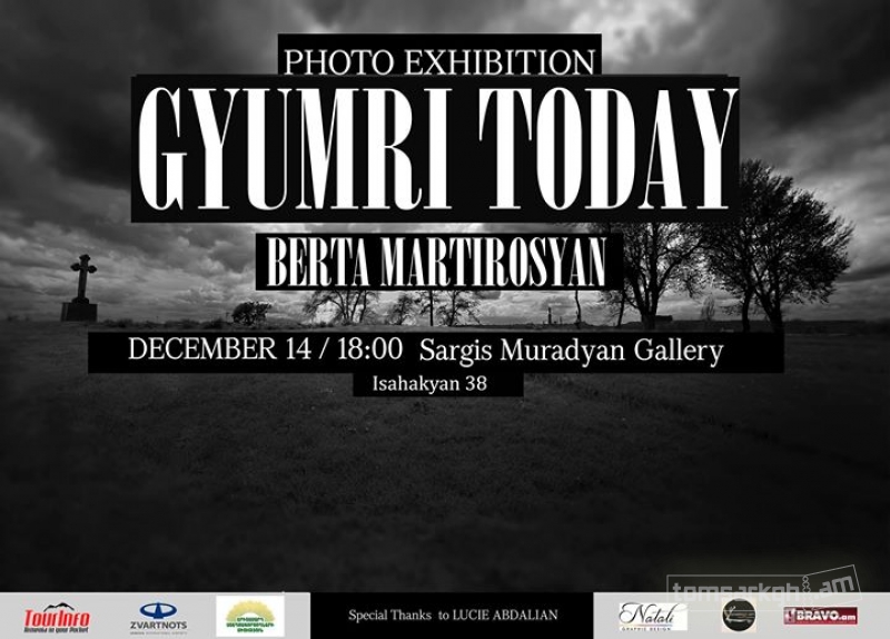Դեկտեմբերի 14-ին` ժամը 18:00-ին Սարգիս Մուրադյան Ցուցասրահում (Իսահակյան 38) կբացվի լուսանկարիչ Բեռտա Մարտիրոսյանի «Գյումրին այսօր» խորագրով անհատական ցուցահանդեսը: