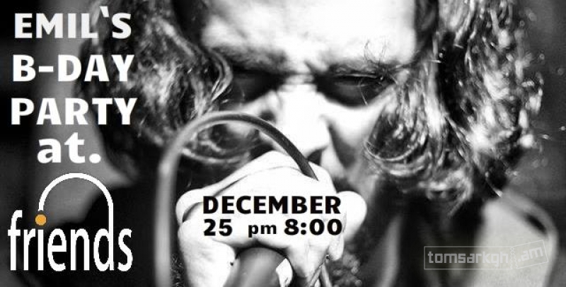 Դեկտեմբերի 25-ին Friends pub-ը Ձեզ հրավիրում է տաղանդավոր, թրաշով, պոչիկով, լիքը իմաստ պարունակող դաջվածքներով, գեղեցիկ ժպիտով, բոլորիս կողմից շատ սիրված ու ամենակարևորը` առաջին բաժակից «ցխկ» անող բարմեն Էմիլի ծնունդը նշելու: