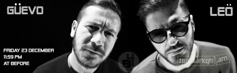 Երեւանյան նայթլայֆի թերեւս ամենահայտնի եւ սիրված դիջեյներից, "Տրիանգուլում" պրոեկտի հիմնադիրներ՝ Գուեւոն ու Լեոն Ձեզ են սպասելու Բիֆորում այս ուրբաթ , ժամը՝ 23:59-ից, ապահովելով որակյալ երաժշտություն ու բարձր տրամադրություն։ Տեք հաուսի սիրահարների համար սա լավագույն ժամանցի տարբերակն է այս ուրբաթ ՝ դեկտեմբերի 23-ին: