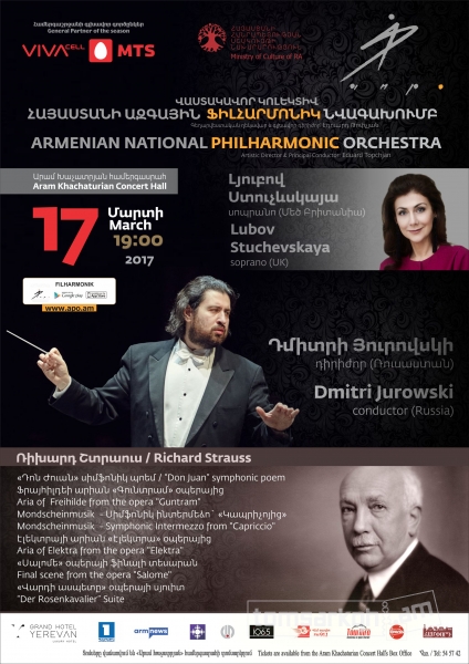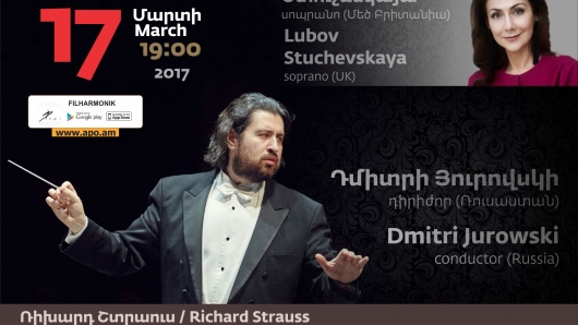 Արամ Խաչատրյան համերգասրահում մարտի 17-ին՝ ժամը 19-ին Ռիխարդ Շտրաուսի երաժշտության երեկո է: Հայաստանի Ազգային ֆիլհարմոնիկ նվագախմբի նվագակցությամբ սոպրանո Լյուբով Ստուչևսկայան կկատարի արիաներ Շտրաուսի սիրված օպերաներից՝ ռուս հայտնի դիրիժոր Դմիտրի Յուրովսկու ղեկավարությամբ: