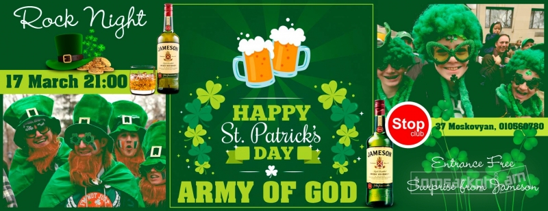 Let's celebrate together St.Patrick's Day with Army Of God at Stop Club! Rock music, unlimited drinks, surprise from Jameson, green mood!