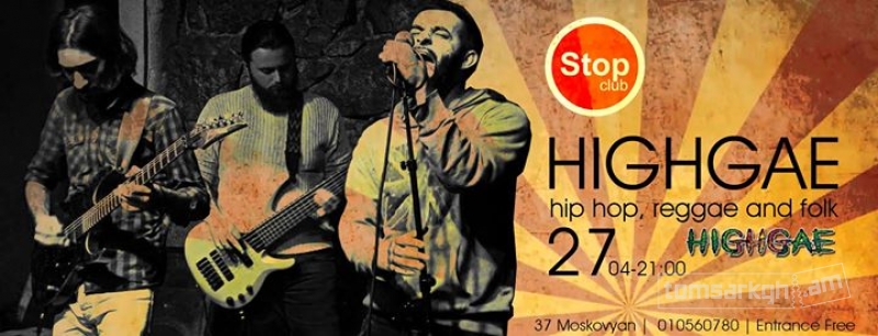 Stop Club-ը հրավիրում է երաժշտական երեկոյի Highgae խմբի մասնակցությամբ, որը ներկայացնում է ինքնատիպ հեղինակային նոր նախագիծը՝ մյուզիք highgae ոճով․ այն իրենից ներկայացնում է յուրօրինակ reggae, hip-hop, folk, blues, rock ոճերի խարնուրդ։ Շտապիր ամրագրել՝ սպասվում է ուրախ, դրական լիցքերով, լավ մյուզիքով ու բարձր տրամադրությամբ լի երեկո։