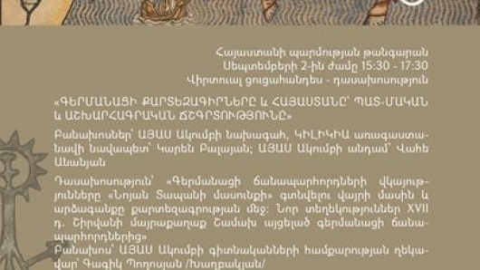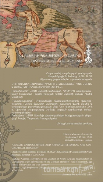 Սեպտեմբերի 2- ին ժամը 15:30 - 17:30-ին Հայաստանի պատմության թանգարանում կկայանա «Գերմանացի քարտեզագիրները և Հայաստանը. պատմական և աշխարհագրական ճշգրտությունը» խորագրով վիրտուալ ցուցահանդես - դասախոսություն