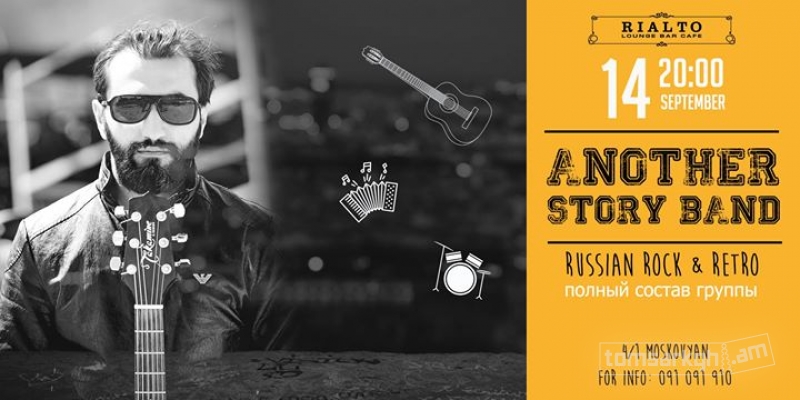 Ռուսական ռոքի և ռետրոյի սիրահարներին հրավիրում ենք Rialto Lounge Bar Cafe ուրախ երաժշտական երեկոյի ընկերական և անմիջական մթնոլորտում: Առաջին անգամ սիրված Another Story Band / Armenia-ը ելույթ է ունենալու ամբողջական կազմով: