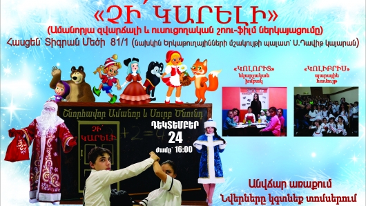Արտ մշակույթի կենտրոնը բոլորին սիրով հրավիրում է նախկին երկաթուղայինների մշակույթի պալատ , դիտելու դեկտեմբերի 24-ին ՝ ժամը 16:00-ին, կայանալիք