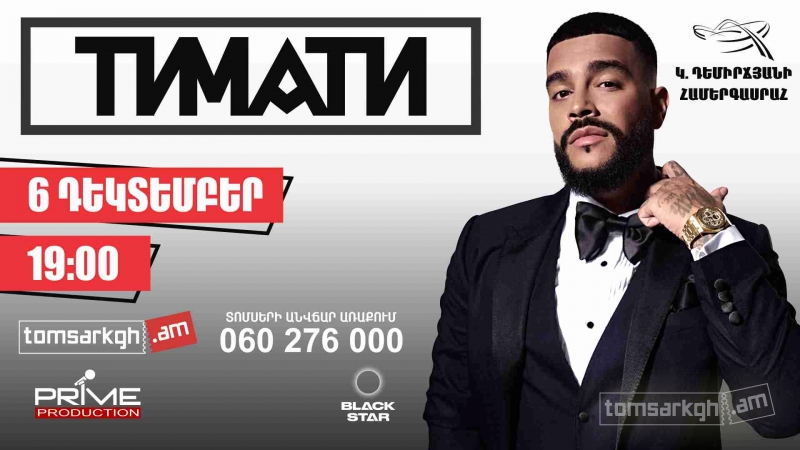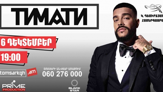 Очень рады сообщить Вам, что 6-го декабря текущего года в большом зале спортивно - развлекательного комплекса им. Карена Демирчяна состоится эксклюзивный концерт одного из самых известных, любимых и харизматичных артистов, и основателя лейбла Black Star - ТИМАТИ!