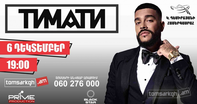 Սիրով տեղեկացնում ենք, որ սույն թվականի Դեկտեմբերի 6-ին ժամը 19:00 Կարեն Դեմիրճյանի անվ. մարզահամերգային համալիրում տեղի կունենա Black Star լեյբլի հիմնադիր և հաջողակ մեգաաստղ խարիզմատիկ և շատերի կողմից սիրված, ՏԻՄԱՏԻԻ բացառիկ մենահամերգը: