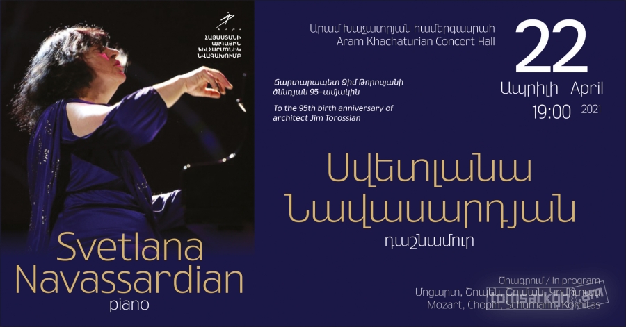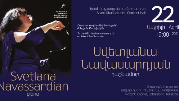 Լեգենդար դաշնակահարուհի Սվետլանա Նավասարդյանի մենահամերգը՝ Ա. Խաչատրյան համերգասրահում՝ նվիրված ճարտարապետ Ջիմ Թորոսյանի ծննդյան 95-ամյակին: