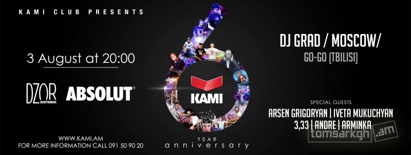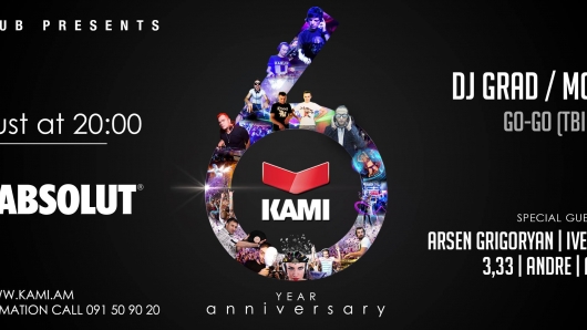 Կամի ակումբի վեց ամյակը մեծ շուքով նշվելու է Աշտարակի ձորում: Առաջին հատվածում կլինի համերգ, իսկ երկրորդ հատվածում կմիանան դիջեյ Անատոլի Գրադը և "Go-go" պարուհիները Թբիլիսիից: