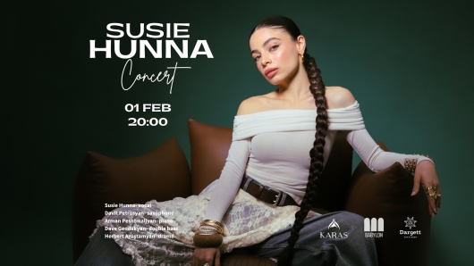 SUSIE HUNNA Փետրվարի 1-ին Բաբելոն թատրոնում Սուսի Հաննայի և տաղանդավոր երաժիշտների հետ միասին շատ ջերմ և ջազային երեկո է սպասվում: Երեկոյի ընթացքում կհնչեն ջազային ստանդարտներ և ոչ միայն՝ Դեյվ Գեոդակյանի գործիքավորմամբ։ Սուսի Հաննա- վոկալ Դավիթ Պետրոսյան- սաքսաֆոն Արման Պեշտմալջյան- դաշնամուր Դեյվ Գեոդակյան- կոնտրաբաս Հերբերտ Առուստամյան- հարվածային գործիքներ