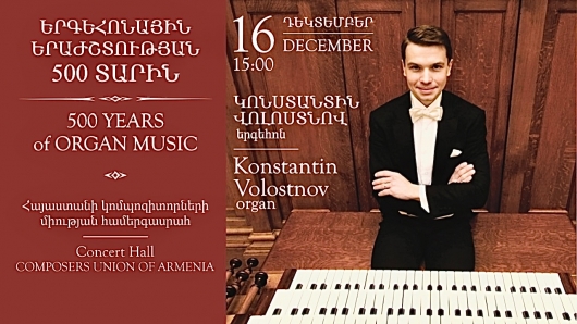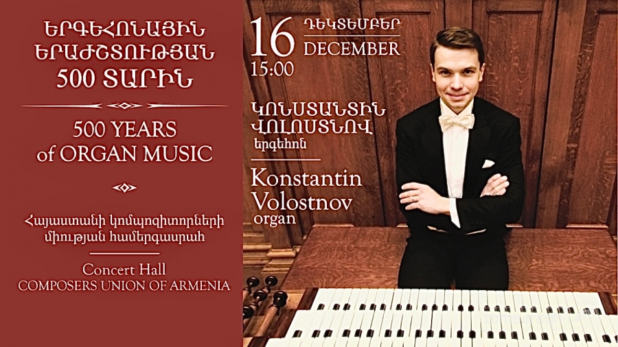 пару ей будет исполнена пьеса современного армянского композитора Арсена Арутюняна, основанная на мелодике армянской духовной музыки. Романтические страницы программы откроет «Соната до минор» Мендельсона. Не все знают, что автор «Свадебного марша», был не только блестящим пианистом, но и выступал как органист. Именно Мендельсон привносит в органную традицию романтическую лирику и театральную образность. Немецкая линия программы продолжится сочинением, уже столетие не покидающим пьедестал органных шедевров XIX века, Прелюдией и фугой на имя B-A-C-H Ференса Листа. С самых первых звуков Лист захватывает слушателя невероятной виртуозностью, контрастами и новой для органа музыкальной мистикой. Здесь же особую роль сыграет и сам инструмент Союза композиторов – на сегодняшний день самый большой из работающих в Армении. Благодаря своему размеру и разнообразию тембров он позволяет исполнять музыку любого периода. Эти качества органа становятся решающими для возможности игры на нём французской музыки позапрошлого века, в которой орган обретает максимальную проникновенность и вместе с тем оркестровость звучания. Всё это характерно для знаменитой и любимой поклонниками органного искусства «Прелюдии, фуги и вариации» Франка, а также и для композитора, создавшего все свои значительные опусы уже в веке XX – органиста Нотр-Дам – Луи Вьерна. Завершит полноту органного спектра опус из трёх миниатюр ещё одного современного автора, созданный уже совсем недавно – в 2014 году. «Три Рождественских песни для органа» Жирайра Шахриманяна – светлая и красивая музыка, как нельзя лучше подходящая праздничному настроению первого зимнего месяца.