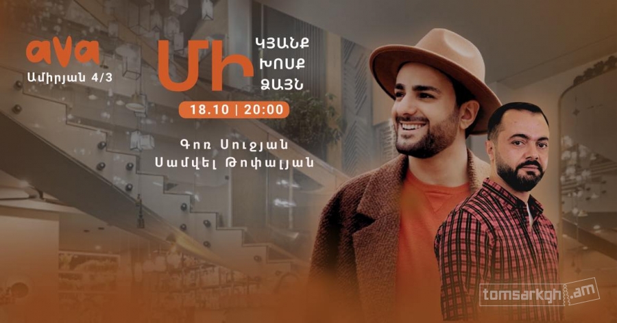 «ՄԻ ԿՅԱՆՔ,ՄԻ ԽՈՍՔ,ՄԻ ՁԱՅՆ» նախագծի շրջանակներում հոկտեմբերի 18-ին՝ ժամը 20։00-ին, AVA -ում Սամվել Թոփալյանն ու Գոռ Սուջյանն իր «Մարդ նվագախումբ» ծրագրով Ձեզ կպարգևեն սիրառատ երեկո։