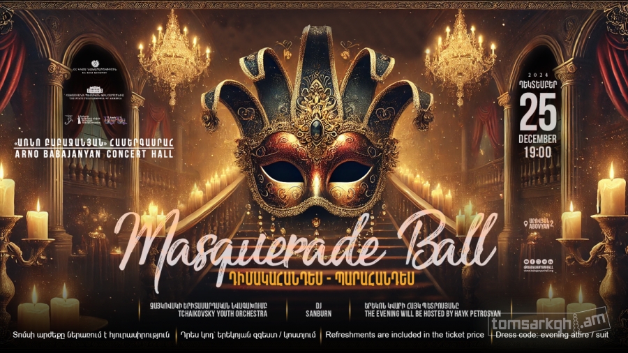 Don't miss this chance to celebrate Christmas in style, at the Masquerade Ball, in the heart of the city. This magical atmosphere will be completed with the warmth of candles, full of music, dance, joyful ambiance and your festive spirit. Save the date: December 25th at 7:00 PM – join us at the Arno Babajanyan Concert Hall (2 Abovyan str.)