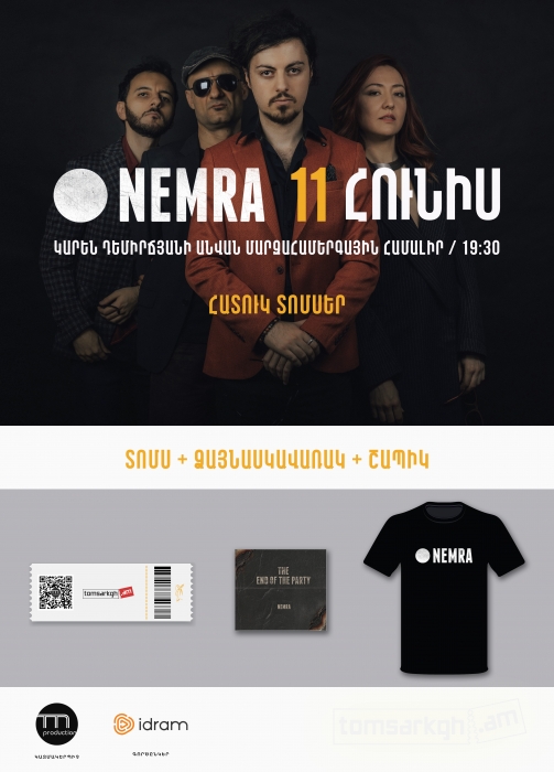 Nemra-ի բազմաթիվ երկրպագուների խնդրանքով այս տարի ևս մեկ համերգով խումբը հանդես կգա Կարեն Դեմիրճյանի անվան մարզահամերգային համալիրում դեկտեմբերի 11-ին: Համերգին կրկին սպասվում են մի շարք անակնկալներ և նոր «End of the Party» ալբոմի ձայնապնակի (VINYL) շնորհանդեսը: Շտապեք ձեռք բերել տոմսերը և բաց մի թողեք հնարավորությունը ձեռք բերել հատուկ տոմսերը որոնք խիստ սահմանափակ են: