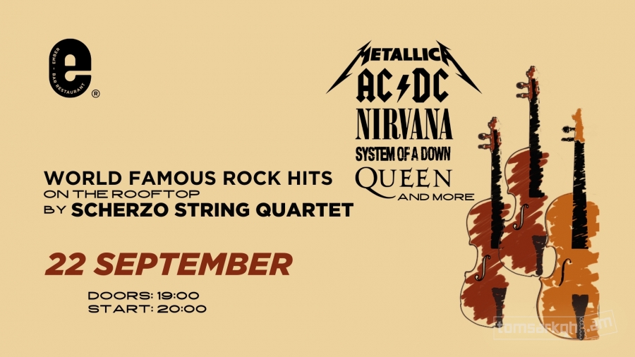 Ռոքի գլուխգործոցները տանիքում՝ սիմֆոնիկ քառյակի կատարմամբ: Աշխարհահռչակ ռոքի լեգենդար հիթերը կհնչեն ՝ Scherzo String Quartet լարային քառյակի կատարմամբ: Մի ամբողջ ռոմանտիկա մեկ համերգում՝ ամառ, տանիք, Հանրապետության հրապարակ, մայրամուտի տեսարան և անսահման ռոք երաժշտություն: