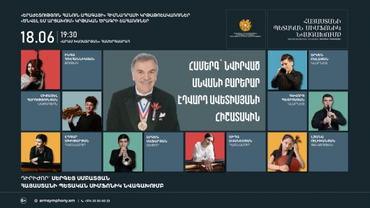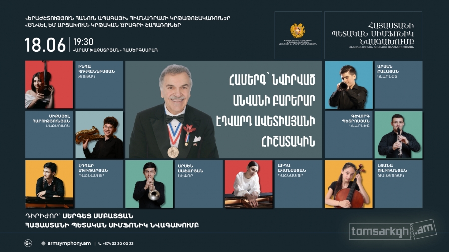 Հունիսի 18-ին համեցե՛ք «Արամ Խաչատրյան» համերգասրահ անվանի բարերար Էդվարդ Ավետիսյանի հիշատակին նվիրված խորհրդանշական համերգին, որի ընթացքում Հայաստանի պետական սիմֆոնիկ նվագախմբի հետ ելույթ կունենան «Երաժշտություն հանուն ապագայի» հիմնադրամի կրթաթոշակառուները և «Ծնվել եմ Արցախում» կրթական ծրագրի շաhառուները։ Դիրիժոր՝ Սերգեյ Սմբատյան։