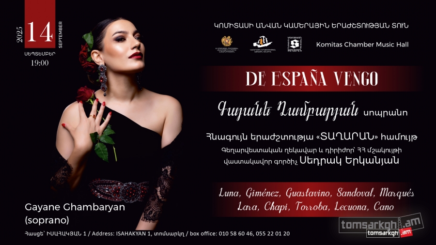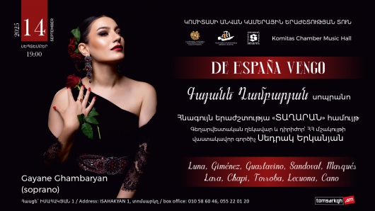 On September 14, at 19:00, at the Komitas Chamber Music hall, the Tagharan Ancient Music Ensemble presents a solo concert of Gayane Ghambaryan, soprano, laureate of international competitions, entitled “De España vengo”. The evening will feature excerpts from Spanish zarzuelas, as well as traditional Spanish songs.