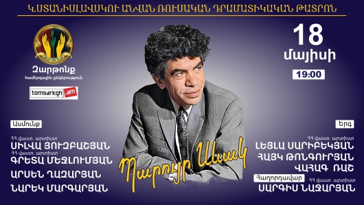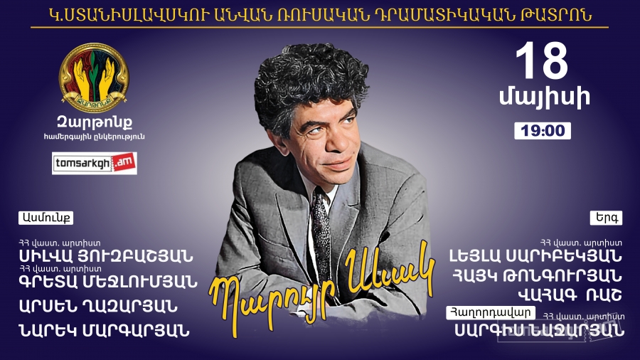 Ստանիսլավսկու անվան ռուսական դրամատիկական թատրոնում ՄԱՅԻՍԻ 18 ին ԶԱՐԹՈՆՔ համերգային ընկերությունը ներկայացնում է գրական- երաժշտական երեկո նվիրված ՊԱՐՈՒՅՐ ՍԵՎԱԿԻՆ Երեկոյի ընդացքում հանդիսատեսը կգտնի իր հոգու և սրտի խոսքը, կապրի նրանով, կգտնի իր անդորրն ու հանգստությունը: