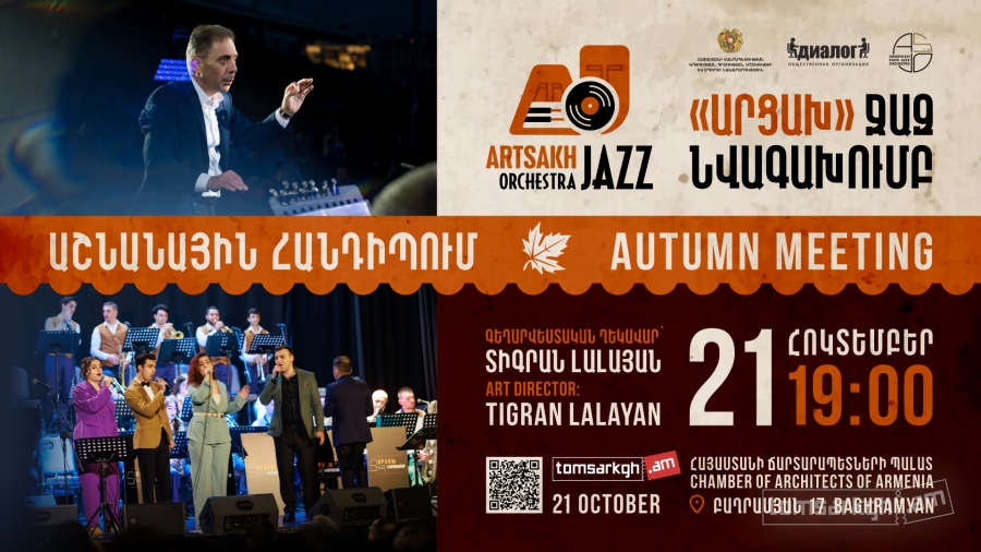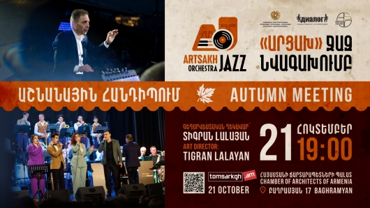 Հարգելի՜ հայրենակիցներ և մայրաքաղաքի հյուրեր, Սիրով հրավիրում ենք Ձեզ ներկա լինելու «Արցախ» ջազ նվագախմբի յուրօրինակ համերգին՝ «Աշնանային հանդիպում» խորագրով։ Նվագախումբը, Տիգրան Լալայանի ղեկավարությամբ, ներկայանալու է նոր և թարմացված ծրագրով, որը կպարգևի անմոռանալի աշնանային ջազային մթնոլորտ։ Ծրագիրը ներառում է ինչպես հայկական, այնպես էլ արտասահմանյան ջազային ստեղծագործություններ` նոր մեկնաբանությամբ և կենդանի կատարմամբ։