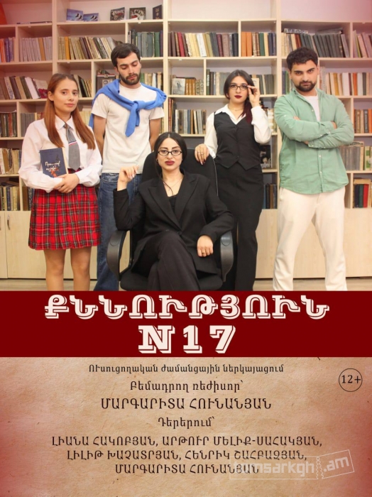 <<Քննություն N 17>> կատակերգական ներկայացում է դպրոցական կյանքի մութ անկյունների մասին, այս պատմությունը ոչ մեկին անտարբեր չի թողնի,քանզի ինչ-որ կատարվում է դպրոցում ,պատմում է աշակերտների և ուսուցիչների լարված հարաբերությունների մասին։ Սակայն ներկայացման ընթացքը կտրուկ փոխվում է երբ տնօրենը անսպասելի կորցնում է հիշողությունը։ Այս պատմությունը բոլորի մասին է, կերպարները ապրում են իրենց կյանքի մի փուլ,որը անտարբեր չի թողնի հանդիսատեսին,և տալիս է այնպիսի հարցի պատասխաններ որոնք հուզում են պատանեկան տարիքում գտնվող երեխաներին, իրենց ծնողներին և ուսուցիչներին։ 1 ժամ 30 ր տևողությամբ ներկայացումը համեմված է հումորային ինչպես նաև ուսուցողական դրվագներով ։ Հինգ տարբեր կերպար՝ամեն մեկը պատրաստ անսպասելիին,իր նպատակին հասնելու համար։ Ս՝եր,կռիվ,ատելություն,շողոքորթություն,հումոր և այս ամենի կիզակետում հիշողությունը կորցրած տնօրեն՝ով կանգնած է պաշտոնը կորցնելու վտանգի առաջ։ Ներկայացումը բարձրացնում է տվյալ տարիքում ձեռք բերվող վատ սովորությունների և դրանց հետևանքների մասին կարևորագույն հարցը։