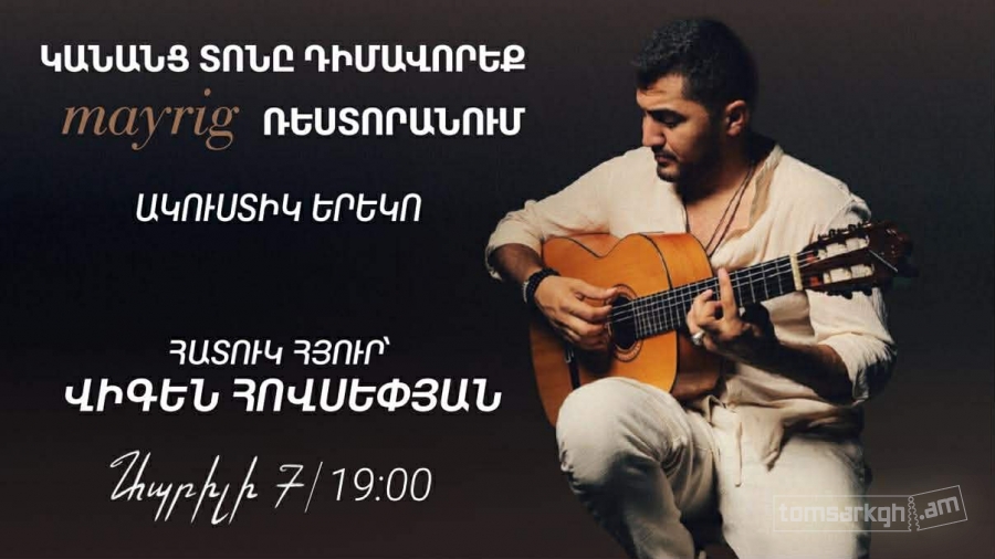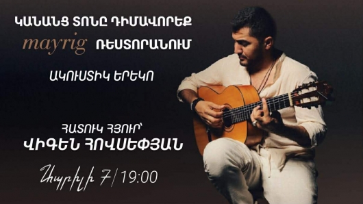 Ապրիլի 7-ին, ժամը 19:00-ին, «Մայրիկ» ռեստորանում Մայրիկ բենդի և Վիգեն Հովսեփյանի մասնակցությամբ հաճելի երեկո, որտեղ գեղեցիկ մթնոլորտը միահյուսվում է ջերմ հանդիպումների ու սիրելի հյուրերի հետ։