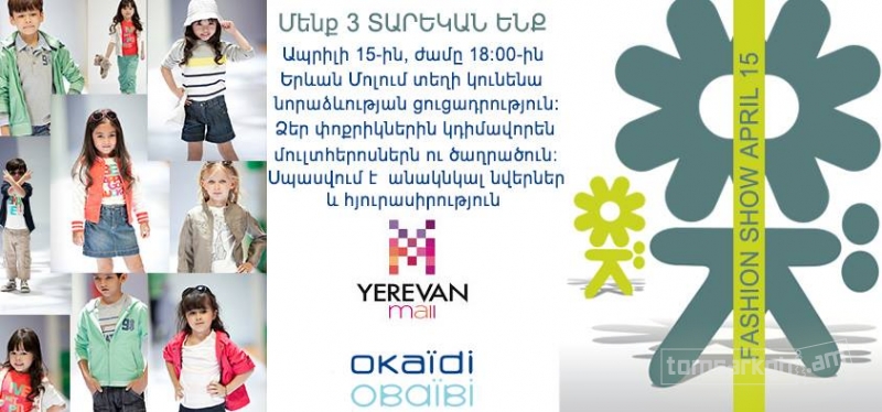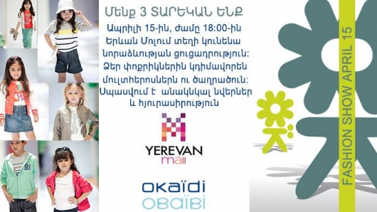 Ապրիլի 15- ին՝ ժամը 18:00- ին Երևան մոլում տեղի կունենա նորաձևության ցուցադրություն: Ձեր փոքրիկներին կդիմավորեն մուլտհերոսներն ու ծաղրածուն: Սպասվում է անակնկալ նվերներ և հյուրասիրություն: