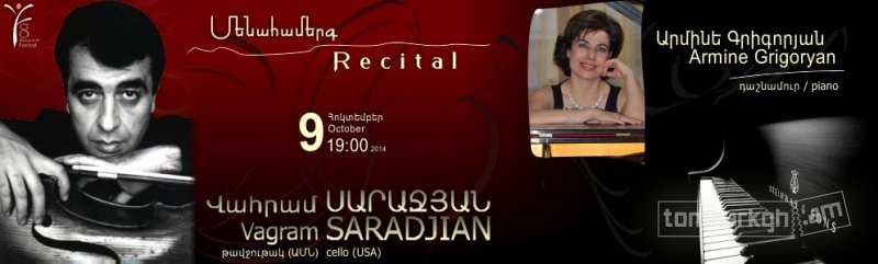Երևանյան 8-րդ միջազգային երաժշտական փառատոնի շրջանակներում ներկայացնում ենք կամերային երաժշտության համերգ՝ թավջութակահար Վահրամ Սարաջյանի (ԱՄՆ) և դաշնակահարուհի Արմինե Գրիգորյանի մասնակցությամբ: