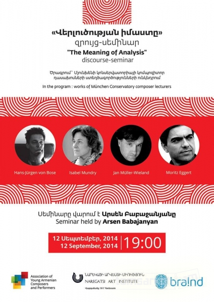 Հայ Երտասարդ Կոմպոզիտորների և Կատարողների Միավորումը և Նարեկացի Արվեստի Միությունը սիրով հրավիրում են սեպտեմբերի 12-ին` ժամը 19:00-ին մասնակցելու սեմինարի, որի ընթացքում կհնչեն Մյունխենի կոնսերվատորիայի դասախոս կոմպոզիտորների ստեղծագործությունները: Սեմինարը վարում է կոմպոզիտոր Արսեն Բաբաջանյանը: Նյութը մասնավորապես հետաքրքրական է երիտասարդ կոմպոզիտորներին և երաժշտագետներին: