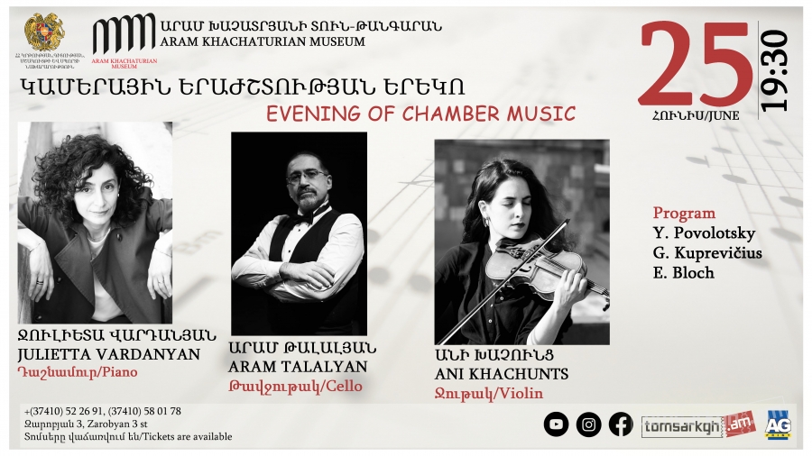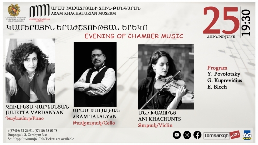 Հունիսի 25-ին՝ ժամը 19:30-ին սիրով հրավիրում ենք Արամ Խաչատրյանի տուն-թանգարանի հյուրընկալ համերգասրահ՝ ունկնդրելու կամերային երաժշտություն: