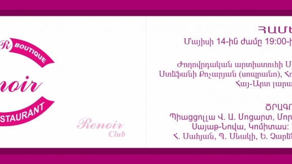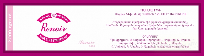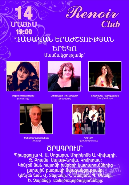 Մայիսի 14- ին` ժամը 19:00- ին Ռենուար ակումբում( Աբովյան 23) տեղի կունենա դասական համերգ: