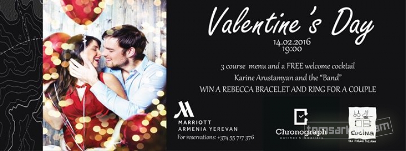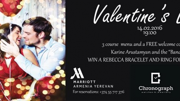 Սբ. Վալենտինի օրը հրավիրում ենք նշեշու Արմենիա Մարիոթ հյուրանոցի Կուչինա Իտալական ռեստորանում` կենդանի երաժշտության ուղեկցությամբ ռոմանտիկ ընթրիքի, որի ընթացքում կարող եք շահել Ռեբեկա ապրանքանիշի կանացի թևնոց և տղամարդու մատանի Խրոնոգրաֆ խանութ-սրահի կողմից:
