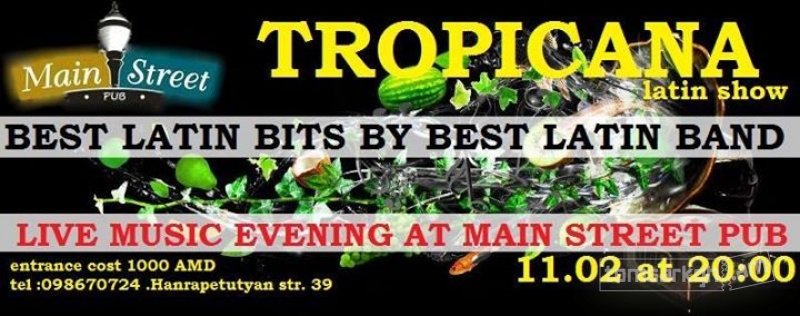 Սիրված լատինական հիթերը կենդանի հնչողությամբ Tropicana latin show band-ի կողմից : այս հինգշաբթի'Main Street pub-ում վայելում ենք երաժշտությունը, ռոմանտիկ միջավայրը, պարում ենք սալսա,բաչատա, չա չա չա, սամբա, մամբո և ոչ միայն )