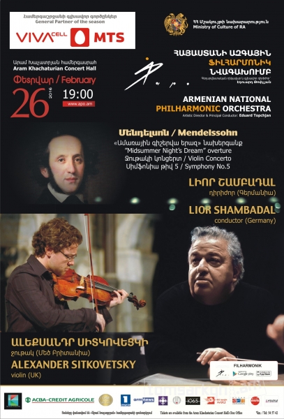 Գերմանացի դիրիժոր Լիոր Շամբադալը Հայաստանի Ազգային ֆիլհարոմնիկ նվագախմբի հետ փետրվարի 26-ին՝ ժամը 19-ին, Արամ Խաչատրյան համերգասրահում կներկայացնի Մենդելսոնյան երաժշտության երեկո: Ծրագրում կհնչեն հեղինակի «Ամառային գիշերների երազ» նախերգանքը, Ջութակի կոնցերտը և թիվ 5 սիմֆոնիան: Մենակատար Ալեքսանդր Սիտկովեցկի (Մեծ Բրիտանիա):