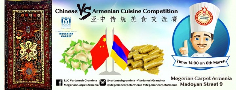 Дорогие друзья! Продолжая добрые традиции Китайского нового года, мы имеем честь пригласить Вас на китайско-армянской кулинарный батл ! Это увлекательное мероприятие организовано тур компанией LLC "Vartanush Grandma" при поддержке посольства КНР в Армении и нашими партнерами Megerian Carpet Armenia ! Судить этот кулинарный поединок будет самый известный бренд - шеф Армении и кулинарный критик - Седрак Мамулян ! Помимо кулинарного состязания Вас ждет насыщенная культурная программа, которая поможет нам раскрыть и достойно представить культуры Китая и Армении! Мы будем искренне рады приветствовать вас на этом удивительном праздникe вкуса, стиля и традиций !
