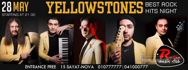 YellowStones խումբը մայիսի 28-ին՝ ժամը 21:00-ին, ՌՈՔ երաժշտության բոլոր սիրահարներին հրավիրում է Retro Music Club անցկացնելու անմոռանալի երեկո որակյալ երաժշտության ուղեկցությամբ: Առաջին անգամ խումբը հանդես կգա ամբողջովին ՌՈՔ ծրագրով, կհնչեն այնպիսի համաշխարհային ռոք խմբերի ստեղծագործություններ ինչպիսիք են՝ Deep Purple, Pink Floyd, Led Zeppelin, Queen, The Beatles, S.O.A.D. և այլն: Երեկոն թեժ է լինելու...