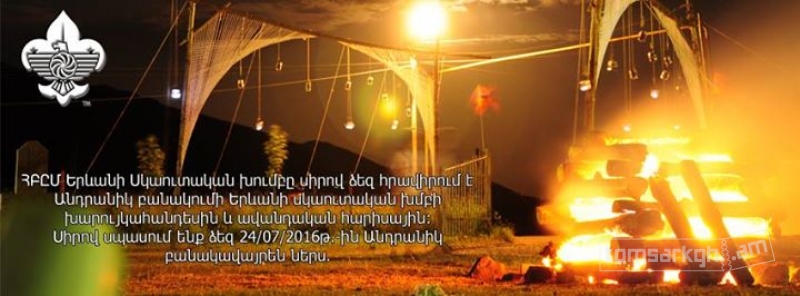ՀԲԸՄ Երևանի Սկաուտական խումբը սիրով հրավիրում է Ձեզ Անդրանիկ բանակումի` Երևանի սկաուտական խմբի խարույկահանդեսին և ավանդական հարիսային:
