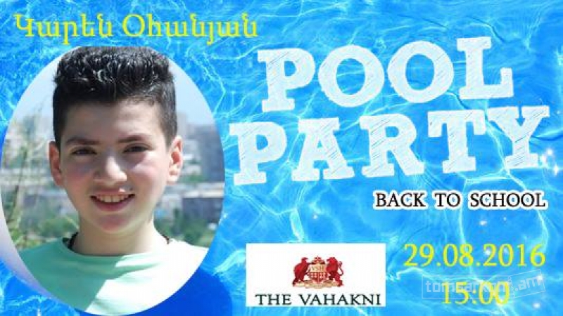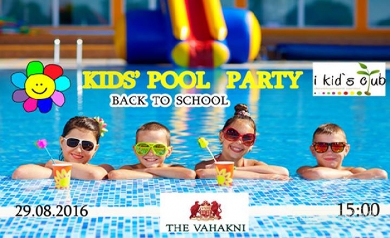 Մինչ նոր ուսումնական տարին , օգոստոսի 29-ին , բոլոր երեխաներին իրենց մայրիկների ուղեկցությամբ հրավիրում ենք Վահագնի թաղամասի լողավազան` մասնակցելու աննախադեպ Kids' Pool Party-ի ,,Back to School ,, խորագրով` սիրված փոքրիկ երգիչ երգչուհիների մասնակցությամբ: