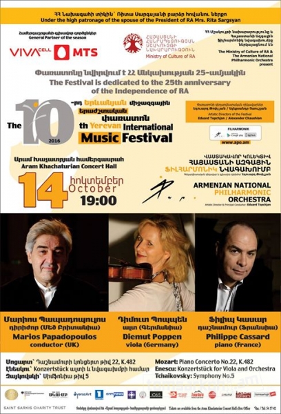 Հայաստանի Ազգային ֆիլհարմոնիկ նվագախումբը, Երևանյան 10-րդ միջազգային երաժշտական փառատոնի շրջանակներում hոկտեմբերի 14-ին՝ ժամը 19-ին, Արամ Խաչատրյան համերգասրահում ներկայացնում է դաշնակահար Ֆիլիպ Կասարին (Ֆրանսիա) և ալտահար Դիմուտ Պոպպենին (Գերմանիա): Ծրագրում՝ Մոցարտ, Էնեսկու և Չայկովսկի: