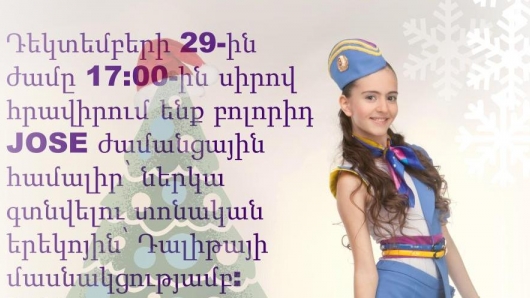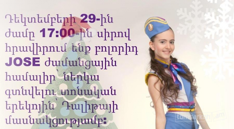 Դեկտեմբերի 29-ին՝ ժամը 17:00 սիրով հրավիրում ենք բոլորին՝ ներկա գտնվելու տոնական երեկոյին Դալիթայի մասնակցությամբ: Երեխաներին սպասվում են անակնկալներ: Եկեք միասին դիմավորենք Նոր Տարին: