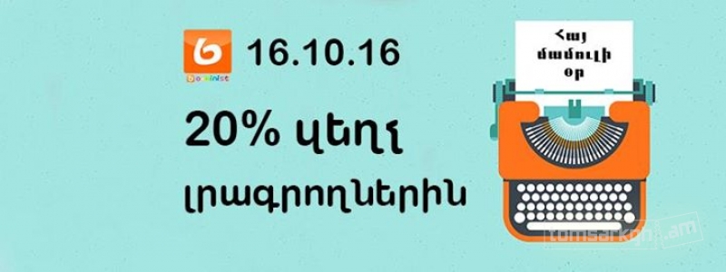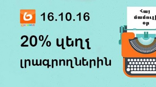 Հոկտեմբերի 16-ին Բուկինիստ գրախանութի բոլոր մասնաճյուղերում կգործի 20% զեղչ լրագրողների համար, ինչպես նաև զանգվածային լրատվամիջոցների ներկայացուցիչները կստանան նվեր կուտակային քարտ. անհրաժեշտ է ընդամենը ներկայանալ աշխատանքային բեյջով կամ լրագրողական գործունեությունը հաստատող այլ փաստաթղթով/հոդվածով/բլոգով...