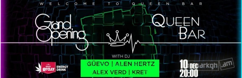 Սիրով հրավիրում ենք՝ դեկտեմբերի 10-ին ներկա գտնվել` QUEEN Bar-ի պաշտոնական բացմանը: 20:00-ից 21:00 տեղի կունենա հյուրասիրություն: Իսկ ժամանացը կապահովվեն DJ s` Güevo-ն, Alen Hertz-ը, Alex Verd-ը և Kret-ը,: Սպասվում է գեղեցիկ անմոռանալի երեկո: Կլինի հյուրասիրություն` Bacardi-ի և Armenia Wine-ի կողմից: