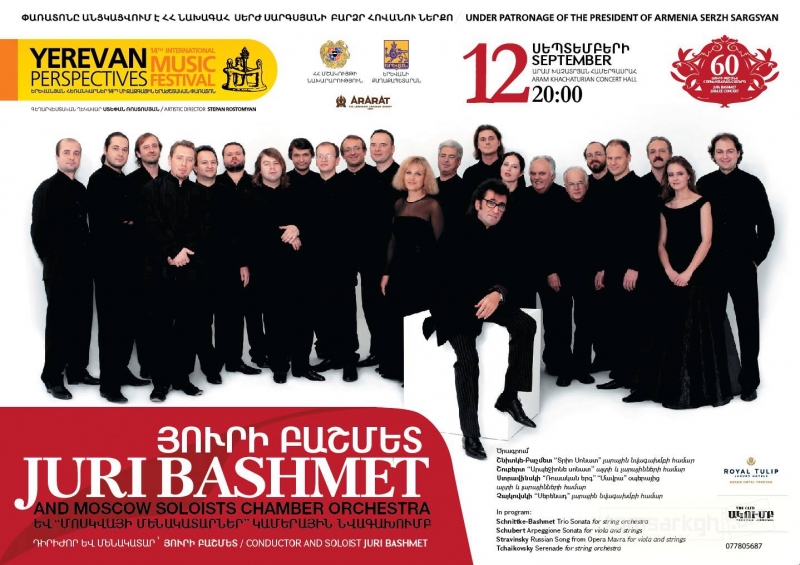 Աշխարհահռչակ ալտահար Յուրի Բաշմետը և «Մոսկվայի մենակատարներ» կամերային նվագախմբը սեպտեմբերի 12-ին «Արամ Խաչատրյան» համերգասրահում, «Երեւանյան հեռանկարներ» 14-րդ միջազգային երաժշտական փառատոնի շրջանակում: