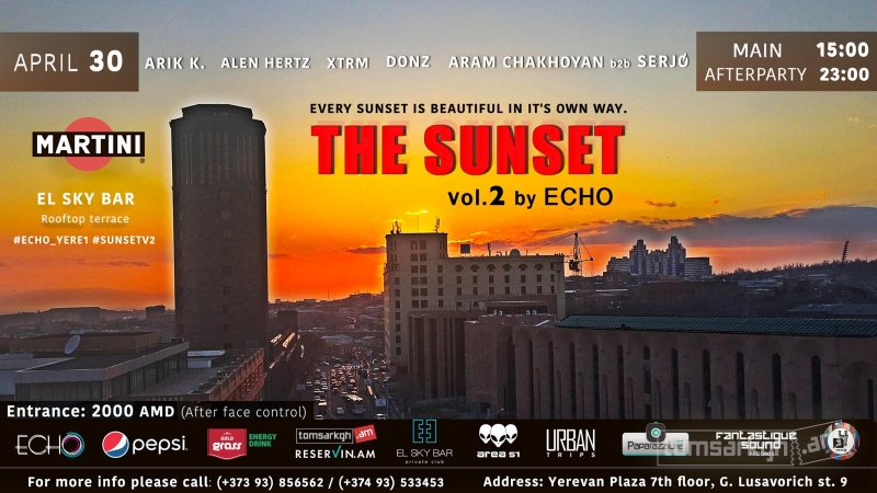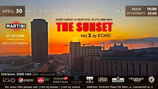 Սիրով տեղեկացնում ենք Ձեզ, որ Echo նախագիծը պատրաստվում է ներկայանալ իր հաջորդ բացօթյա SunSet (vol.2) միջոցառումով, որը տեղի կունենա ամենասիրված և հայտնի` El SKY BAR-ի տանիքում: