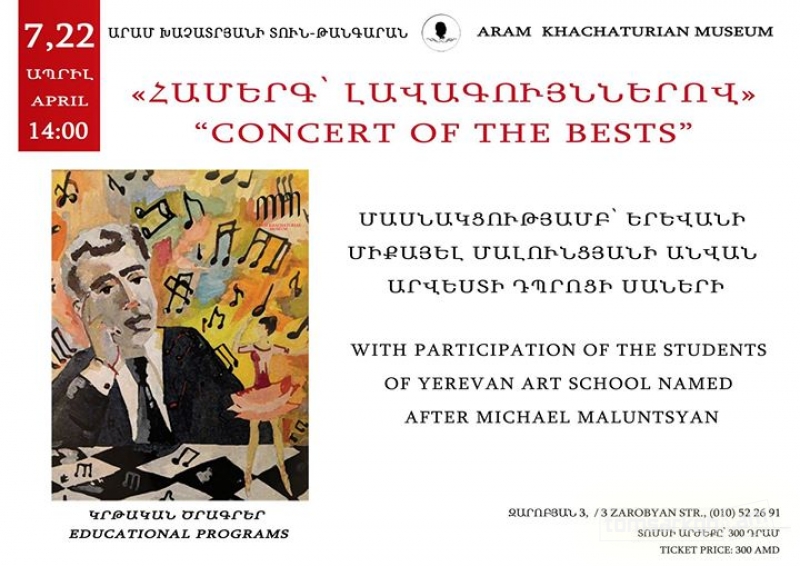 Ապրիլի 22-ին, ժամը 14:00-ին Արամ Խաչատրյանի տուն-թանգարանում տեղի կունենա «Համերգ՝ լավագույններով» շարքի հերթական համերգը: