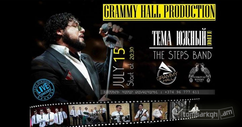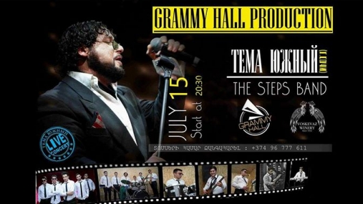 Հուլիսի 15-ին ժամը 20:30-ին Grammy Hall-ում տեղի կունենա Тёма Южный-ի և The Steps Band-ի մենահամերգը կենդանի հնչողությամբ։ Ձեզ սպասվում է հյուրասիրություն մրգի տեսականի և Ոսկեվազի գինի: Հաճելի և դրական երեկոն ապահոված է։ Տեղեկությունների համար խնդրում ենք զանգահարել: