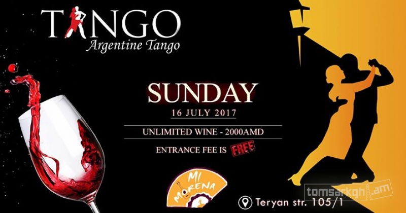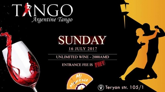 Դարձրեք Ձեր Կիրակի երեկոն յուրահատուկ՝ համեցեք Մի Մորենա և սովորեք պարել Արգենտինական Տանգո 20։00-21։00-ի ընթացքում, որից հետո վայելեք Տանգոյի պարային երեկոն, օգտվեք անսահմանափակ գինու առաջարկից՝ անձն ընդամենը 2.000դրամ։